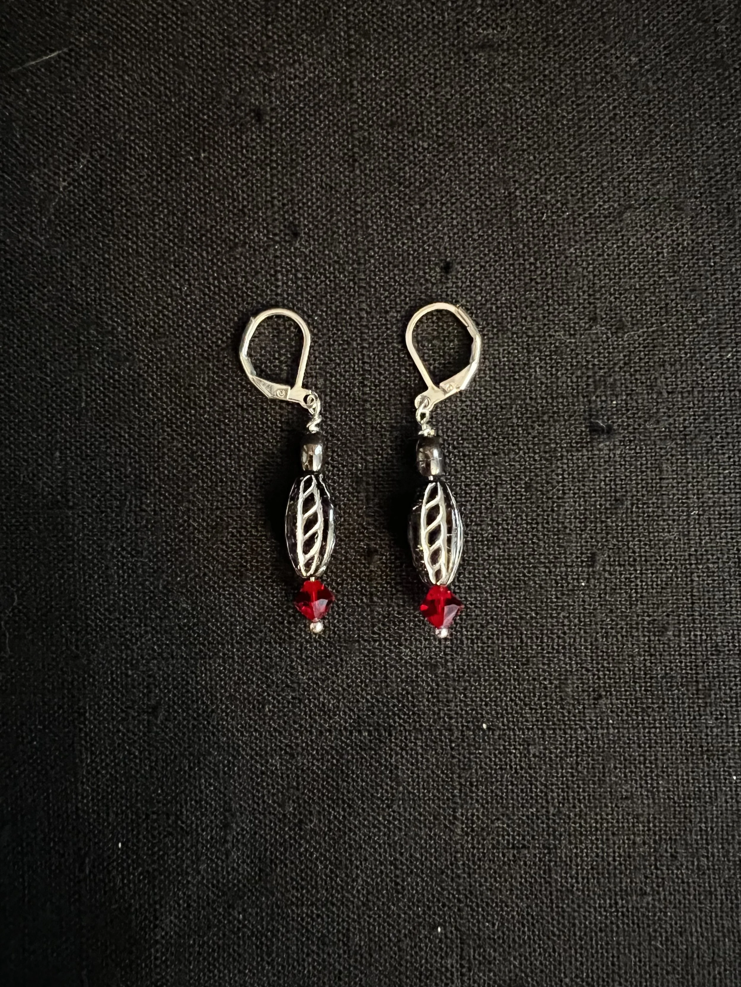 Silver-washed jet black travertine twisted oval beads (15×9mm) accented with hematite and Czech glass bicone scarlet beads; on sterling silver plated lever backs